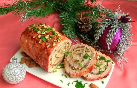 Vi presento una ricetta per un piatto che è diffuso in Russia durante le feste o Capodanno, ma proposto in chiave più moderna. Parliamo del rotolo di carne di lonza di maiale farcito con mandorle, funghi e cipolla.
