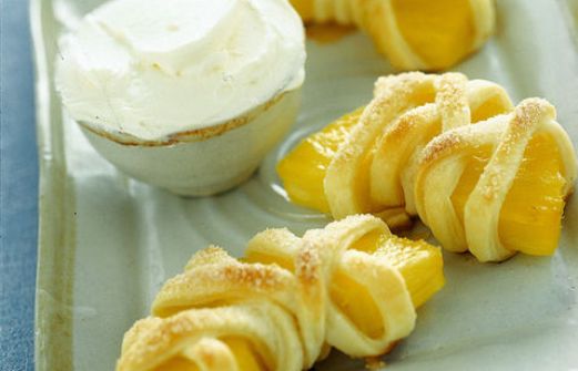 Ingredienti 6 ft Ananas 150 g Mascarpone 2 dl Panna Montata 1 n Pasta Sfoglia 100 g Yogurt Di Latte Intero 2 cu Zucchero 3 cu Zucchero A Velo Preparazione Taglia a lunghe striscioline di circa 1/2 cm una confezione di pasta sfoglia fr [...]