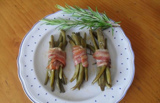 INGREDIENTI: 400g di fagiolini 10 fette di pancetta rosmarino e maggiorana olio, sale, pepe q.b. Lessare i fagiolini in acqua bollente, scolarli ancora croccanti e lasciarli raffreddare. Formare dei ciuffi con circa dieci fagiolini e arrotolarli con una fetta di pancetta. Metterli in una pa [...]