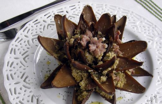 Per 3 carciofi - mezza cipolla - 1 salsiccia - 100 gr di pane grattato - prezzemolo Tritare bene il prezzemolo e la cipolla, dopodichè unirlo al pan grattato e alla salsiccia spezzettata a pezzi molto piccoli; aggiustare di sale, olio e pepe. Lavare accuratamente i carciofi, tagliar [...]