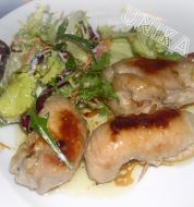 8 fettine sottili di fesa di tacchino 8 fette di prosciutto crudo 8 fettine sottili di formaggio tipo fontina o asiago 2 spicchi dì aglio 1 cipolla 2 toglie di alloro 2 dl di vino bianco secco olio di oliva extravergine sale pepe