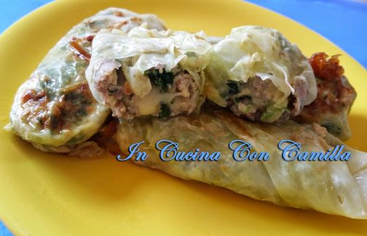 Ingredienti per 7 involtini : 200 g di carne macinata (maiale, manzo o misto), 100 g di spinaci lessi, 1 uovo, 100 g di formaggio tipo asiago, sale e pepe q.b., 7 foglie di verza, un cipollotto o mezza cipolla bianca, 3 cucchiai di olio extravergine d'oliva, mezzo bicchiere di vino bianco,14 [...]