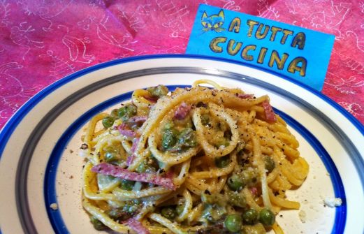 Ingredienti: 350g bigoli di pasta fresca, 70g salame affumicato a listarelle, 15 asparagi verdi, 100g piselli sgranati, 100g formaggio spalmabile, 1 cucchiaino prezzemolo tritato, 50g grana grattuggiato, olio, sale, pepe Tagliare i gambi degli asparagi a rondelle, mettendo da parte le punt [...]