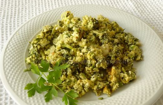 Uova strapazzate con zucchine, erbette, ricotta e profumo di aromi Ingredienti : 6 uova; 2 g basilico 300 g zucchine 200 g erbette già cotte 250 g ricotta 3 g aneto: 5 g salvia 2 cucchiai prezzemolo sale, pepe, olio 2 cipollotti grandi 2 spicchi d'aglio Preparazion [...]