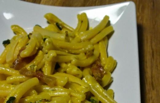 Un mix di sapori per questo gustoso primo piatto... 320 gr di casarecce secche 2 zucchine 50 gr di guanciale tagliato a striscioline 1 uovo 1 tazzina di latte 1 bustina di zafferano Sale Mettiamo a bollire l'acqua per la pasta, intanto riduciamo a [...]