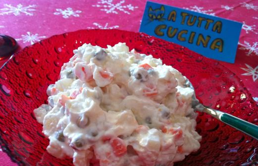 Ingredienti: 300g carote a dadini, 300g patate a dadini, 300g piselli surgelati, 2 tuorli a temperatura ambiente, 1 cucchiaino di aceto, 1 cucchiaio succo di limone filtrato, 230ml olio di semi, 2 cucchiai di yogurt al naturale (il mio ), sale, pepe