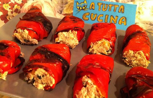 Ingredienti: 2 grandi peperoni rossi (600g), 60g olive nere denociolate e tritate, 20g pinoli, 200g tonno al naturale sbriciolato, 6 fili di erba cipollina tagliuzzati, 100g ricotta, olio, sale, pepe Tagliare i peperoni in 4 falde, adagiarle su una teglia e cuocerle in forno già caldo a 20 [...]