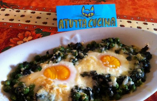 Ingredienti: 300g piselli sgranati, 500g spinaci, 1 spicchio d'aglio, 3 fili di erba cipollina tagliuzzati, 4 uova, 80g Parmigiano Reggiano grattuggiato, olio, sale Rosolare lo spicchio d'aglio in 2 cucchiai d'olio per 3 minuti, unirvi i piselli e cuocere per 10 minuti; aggiungere gli spin [...]