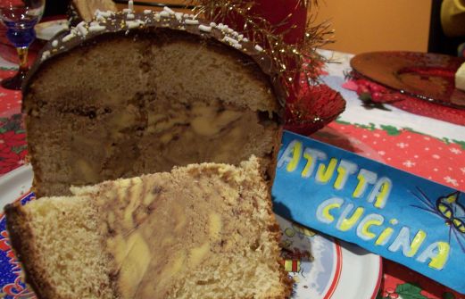 Ingredienti: 1 panettone casalingo di 800g, 100g cioccolato fondente a pezzetti, 40g gocce di cioccolato fondente, 20g burro, 500g gelato alla crema, 100g croccantino sbriciolato, 2 cucchiai granella di zucchero, 2 cucchiai di codette dorate e argentate Tagliare la calotta al panettone, svu [...]