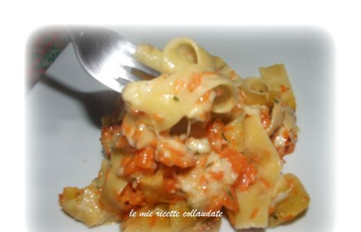 INGREDIENTI per 4 persone: 250 g di pappardelle all'uovo 350 g di zucca già pulita 250 g di scamorza affumicata 250 ml di besciamella 40 g di grana padano grattugiato 2 scalogni uno spicchio d'aglio un mazzetto di prezzemolo 50 g di burro sale e pepe Sbucciate gli sca [...]
