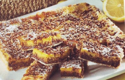 Ingredienti: 1 confezione di pastafrolla, 400 g di crema pasticciera, tre cucchiai di crema spalmabile alle nocciole, 200 g di noci e nocciole tritate, quattro cucchiai di zucchero, decorazione: zucchero a velo preparazione fate saltare in padella nello zucchero la frutta secca per 10 minuti. S [...]