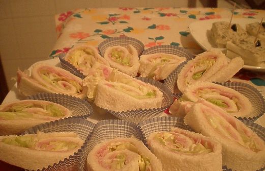 Antipasto rapidissimo.. Pane per tramezzini steso con mattarello e spennellato di maionese Adagiato sopra prosciutto cotto e larruga, poi arrotolare con pellicola trasparente e mettere in frigo una notte. Il giorno dopo taglieare a dischetti da porre su dei pirottini e servire.