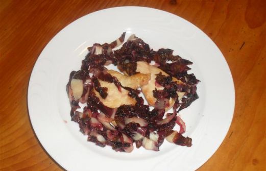 INGREDIENTI per 4 persone: 4 fette di petto di pollo 2 cespi di radicchio rosso mezzo bicchiere di vino bianco olio q.b. farina q.b. sale e pepe q.b. Passare il pollo nella farina e farlo dorare in una padella con l'olio, a fuoco dolce. Unire il radicchio tagliato sottile e bagnare con il vino. [...]