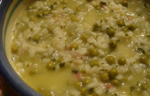 Una minestra più che un risotto, per un piatto della tradizione veneta, ricordo con nostalgia quello che mi preparava la nonna, coi piselli freschi e col brodo fatto coi loro baccelli. Era la minestra offerta ai Dogi il giorno di San Marco, nel momento di massima produzione di questi legumi. [...]