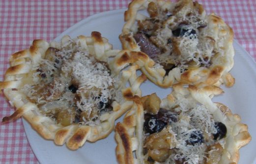 Ingredienti una confezione di pasta sfoglia due melanzane una cipolla olive nere olio sale 4 cucchiai di parmigiano grattugiato Difficoltà Procedimento Facciamo rosolare le melanzane tagliate a cubetti con la cipolla e le olive nere. Saliamo e facciamo proseguire la cottura. Prepa [...]