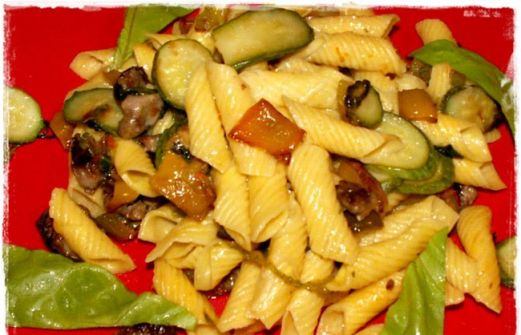 INGREDIENTI: 400 gr di garganelli all'uovo, 2 peperoni gialli, 3 zucchine chiare, 15 fiori di zucchina, 6 foglie di lattuga, 1 fettina di vitello, 60 gr di parmigiano Reggiano, 1 spicchio d'aglio, olio extravergine di oliva, sale. PROCEDIMENTO: [...]