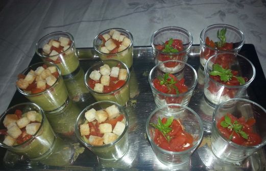 Bicchierini per antipasto: caprese e vellutata di piselli. Bicchiere 1: pepite di mozzarella, pomodorini Pechino tagliati in otto, basilico, olio sale origano e quadrucci di pane tostato. Bicchiere 2: piselli saltati in padella con cipolla ed olio poi frullati pomodorini e pane tostato