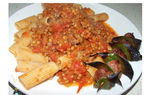INGREDIENTI per 4 persone 320 g di rigatoni 150 g di lenticchie 300 g di salsiccia 1 peperoncino fresco 400 g di pomodori pelati zucchero brodo vegetale 1/2 cipolla 1 costa di sedano 1 carota alloro olio evo sale Preparate un trito con cipolla,sedano e carota. [...]