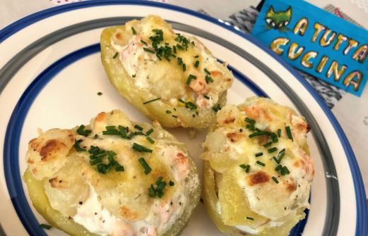 Ingredienti: 3 grosse patate, 100g salmone affumicato tagliuzzato, 100g stracciatella, 70g panna da cucina, 5 fili di erba cipollina tagliuzzati, 1 cucchiaino raso cimette di aneto, 1 cucchiaio di pangrattato, olio, sale, pepe Porre le patate in abbondante acqua fredda, portare a bollore, [...]