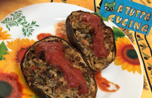 Ingredienti: 3 melanzane tonde (870g), 400g petto di pollo, 150g salsiccia di pollo, 80g cipolla, 60g grana grattugiato, 170g passata di pomodoro, 5 foglie di basilico tagliuzzate, origano, olio, sale, pepe Tagliare le melanzane a metà nel senso della lunghezza, metterle su una teglia rive [...]