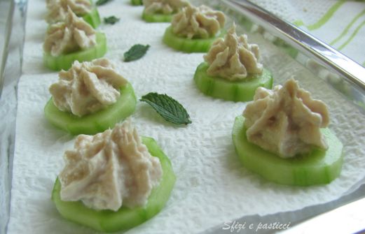 Un antipasto fresco e gustoso! Ingr: 1 cetriolo 1 scatoletta di tonno piccola 100 gr: di ricotta Qualche fogliolina di menta Sbucciare il cetriolo e tagliarlo a rondelle spesse, salare e lasciare da parte. Preparare la crema frullando il tonno ben sgocciolato, la ricotta e le [...]