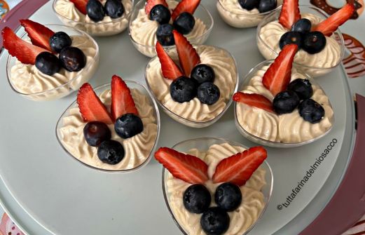 crema pasticciera panna veg fragole - mirtilli Non ci sono dosi perchè ho fatto a occhio. Montare la panna veg ed incorporarla alla crema pasticciera, ottenendo una crema diplomatica. Tagliare alcune fragole a dadini e metterle sul fondo delle coppette, ricoprire con la crema diplomatica utiliz [...]
